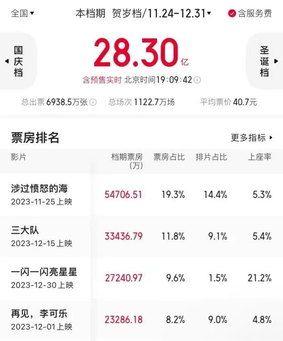 据猫眼数据显示,截至2023年12月22日19时,贺岁档票房为28.3亿元。与往年贺岁档相比,全国票房表现较为平淡。目前位居票房榜首的《涉过愤怒的海》上映28天达5.47亿元票房,排名第二位的《三大队》票房为3.42亿,尚未出现影片票房能冲击10亿元大关。