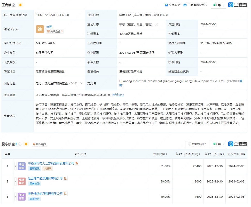 每经AI快讯,企查查App显示,近日,华能工投(连云港)能源开发有限公司成立,法定代表人为徐霆,注册资本4亿元人民币,经营范围含建设工程设计、电池制造、储能技术服务、风力发电技术服务、电力行业高效节能技术研发、集中式快速充电站等。股东信息显示,该公司由华能国际子公司华能国际电力江苏能源开发有限公司,以及连云港市能源集团有限公司、灌云绿港能源管理有限公司共同持股。